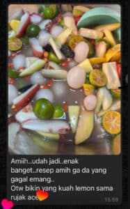 – kuah asinan terdiri dari cabe, gula dan perasan air lemon.
